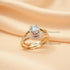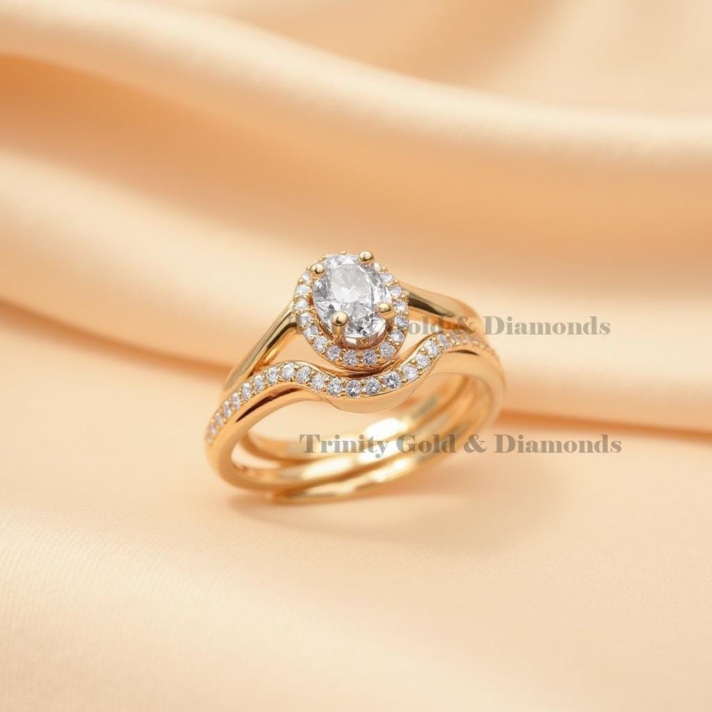 Celebrate your forever with this oval halo bridal ring set, beautifully designed in 18K gold plated 925 sterling silver. Featuring a dazzling oval-cut center stone surrounded by a halo of sparkling stones, the engagement ring pairs seamlessly with a curved wedding band that adds an elegant contour. image is ai generated.