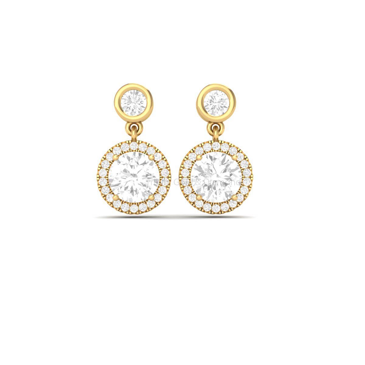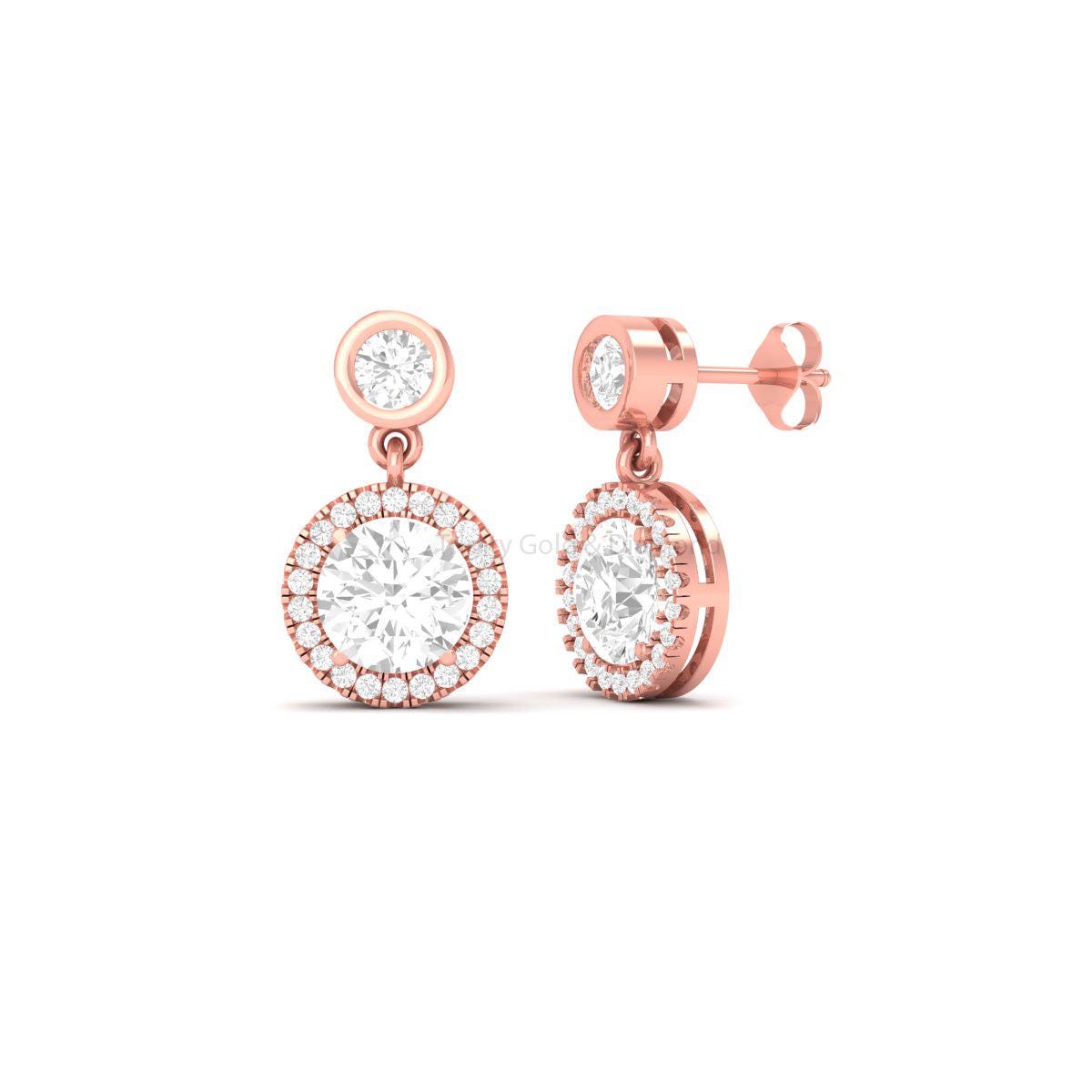 • Elegant Dangle Earrings: Double halo drop earrings with bezel-set and halo stones.