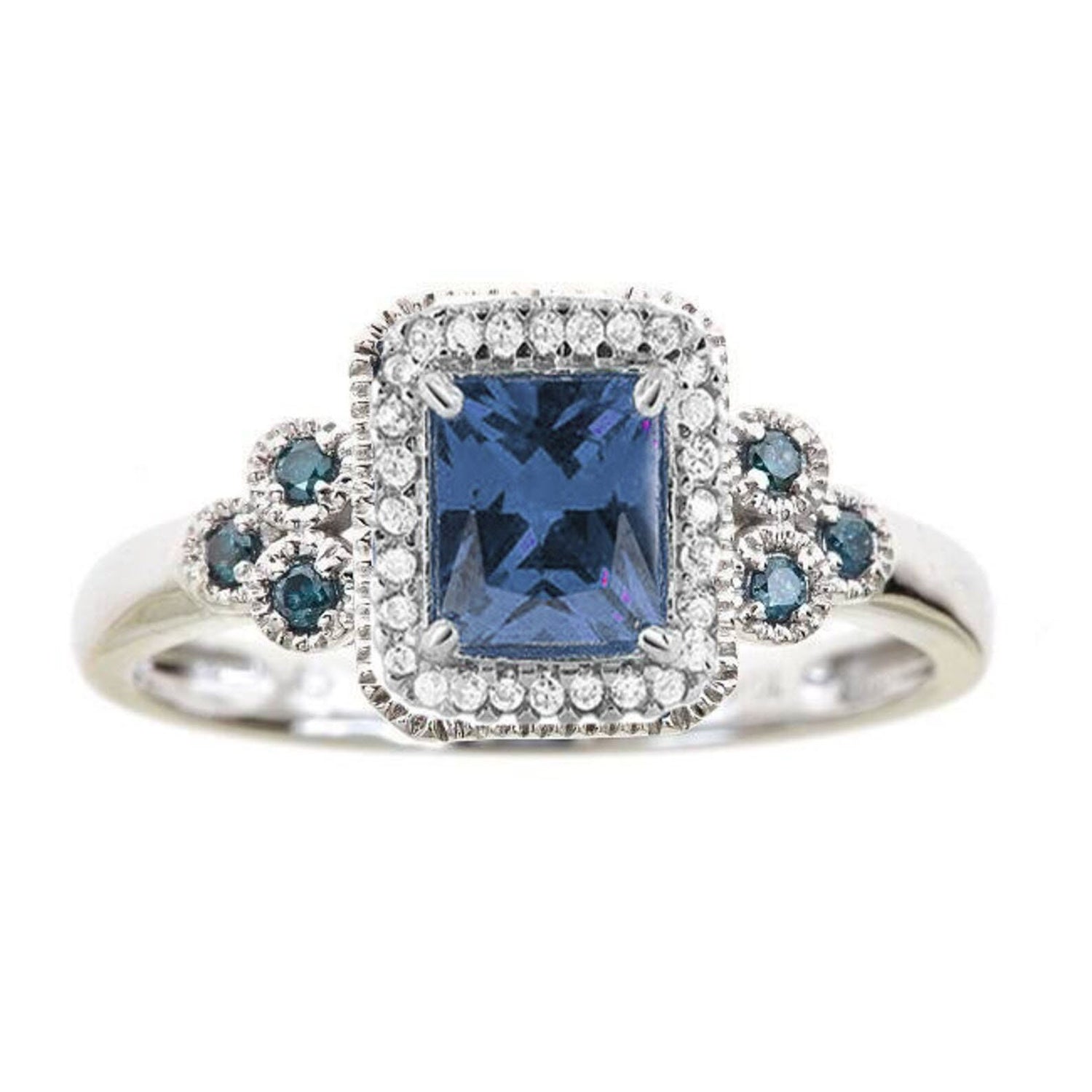 Blue Sapphire Engagement Ring, Handmade Rings, Emerald Cut Sapphire Halo Moissanite Engagement Ring For Her With 14kt White Gold Plated