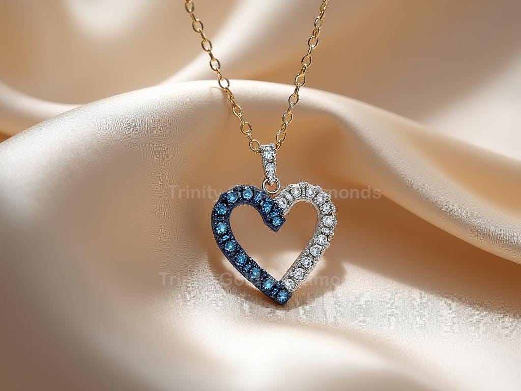 This elegant open heart pendant features a graceful blend of shimmering white and vibrant blue lab grown diamonds, perfectly set in polished 925 sterling silver. A timeless design that represents love and harmony, this necklace makes a thoughtful gift for anniversaries, birthdays, or just because. image is ai generated.