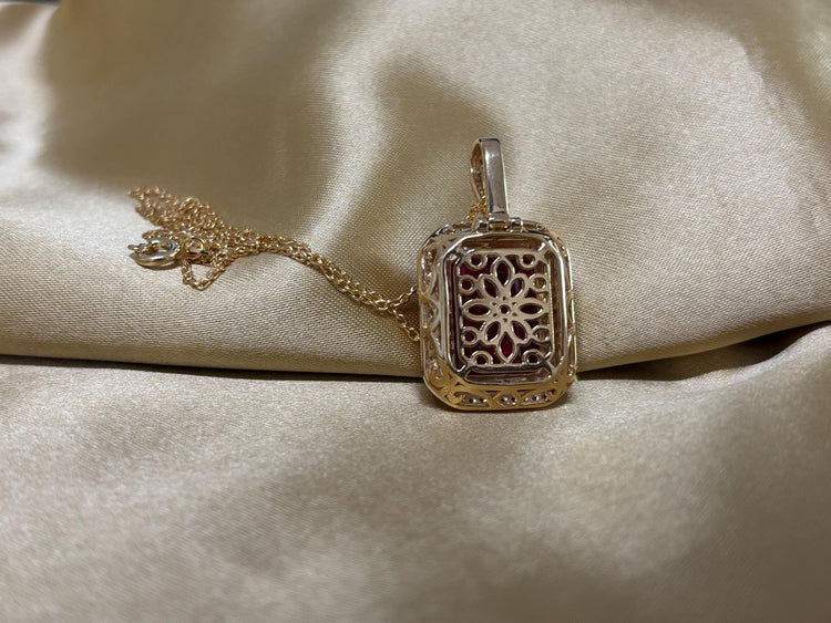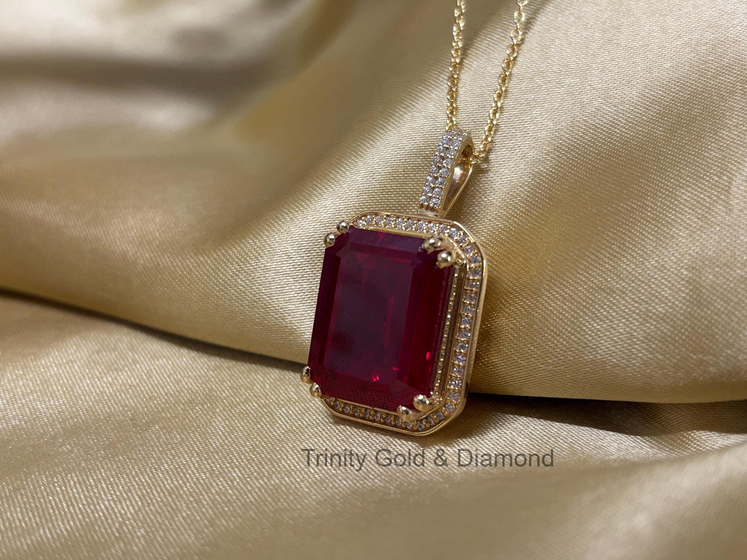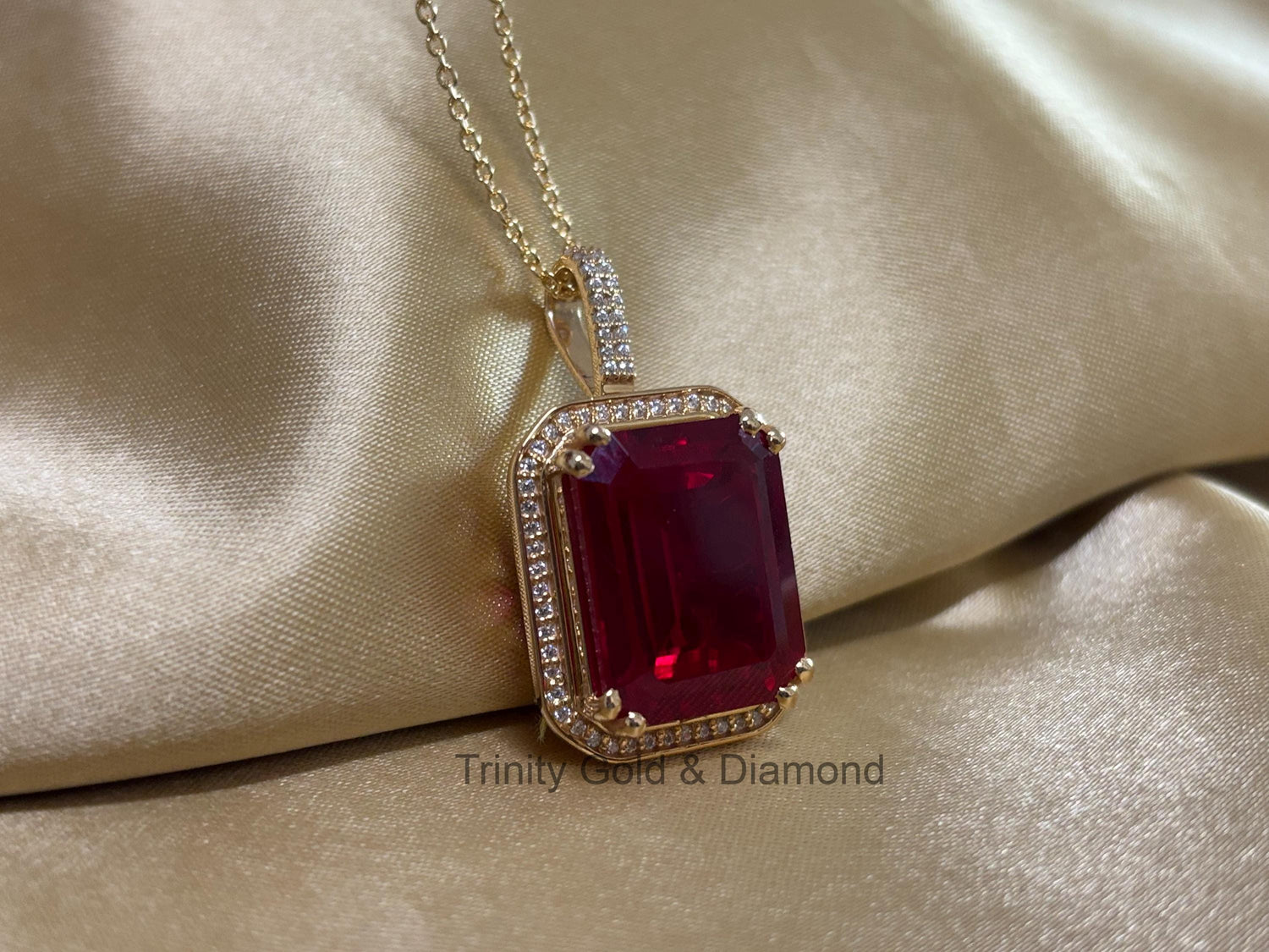 This exquisite big ruby pendant features a vibrant ruby centerpiece surrounded by a radiant diamond halo, including moissanite accents for added sparkle. Designed for women who adore luxurious and timeless jewelry, this pendant is ideal for special occasions or as a thoughtful gift for her. Its classic design makes it a standout addition to any collection.