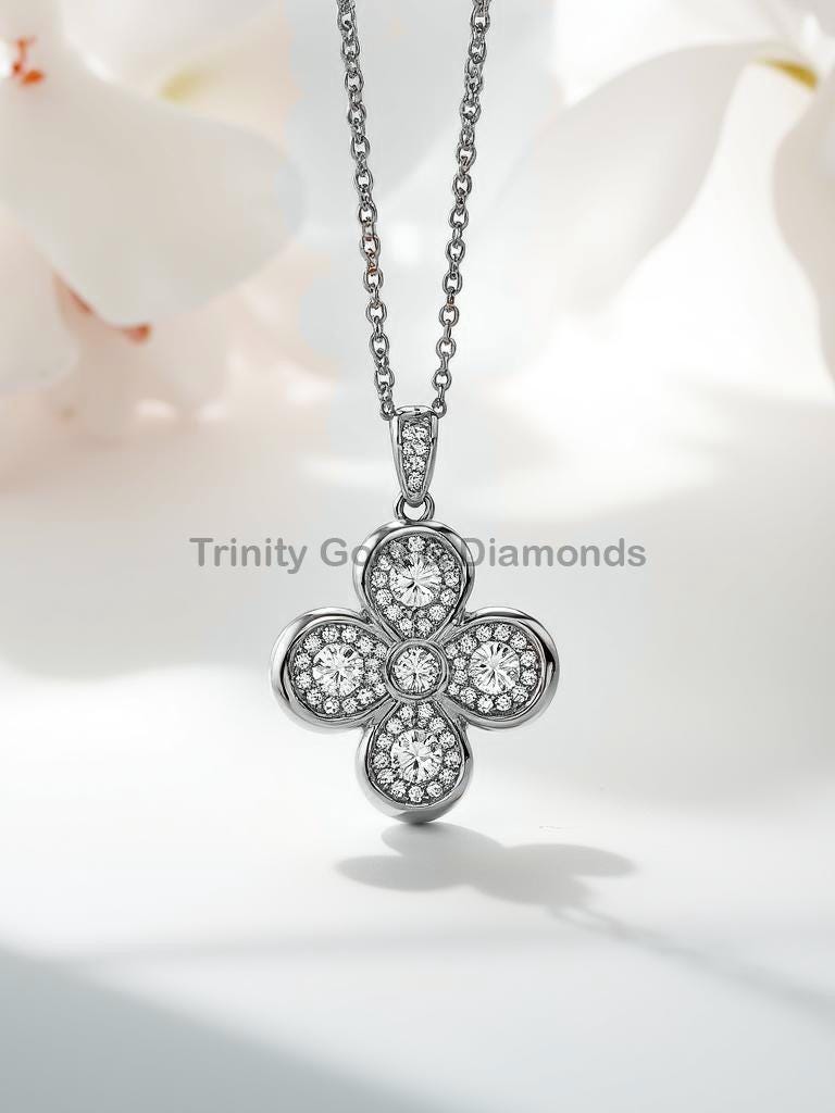 Clover Diamond Pendant Necklace in White Gold, Teardrop Cluster Floral Pendant, Dainty Four Petal Lucky Charm, Elegant Gift for Her