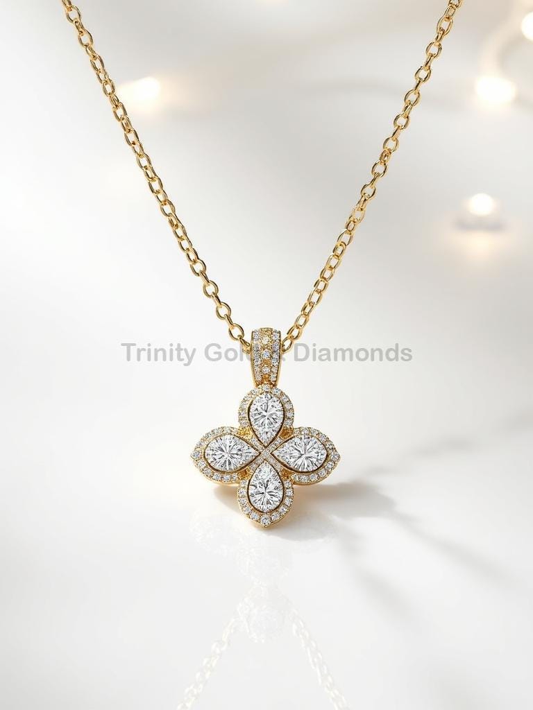 This luxurious Clover Diamond Pendant is crafted in glowing yellow gold and designed with four teardrop-shaped petals resembling marquise diamonds. Each petal sparkles with brilliant round-cut diamonds framed in a pavé halo, forming a stunning floral clover silhouette. The diamond-studded bail and elegant chain complete this timeless piece, perfect for special occasions or as a meaningful gift celebrating love and luck. chain will be cable chain, product will be 100% match.