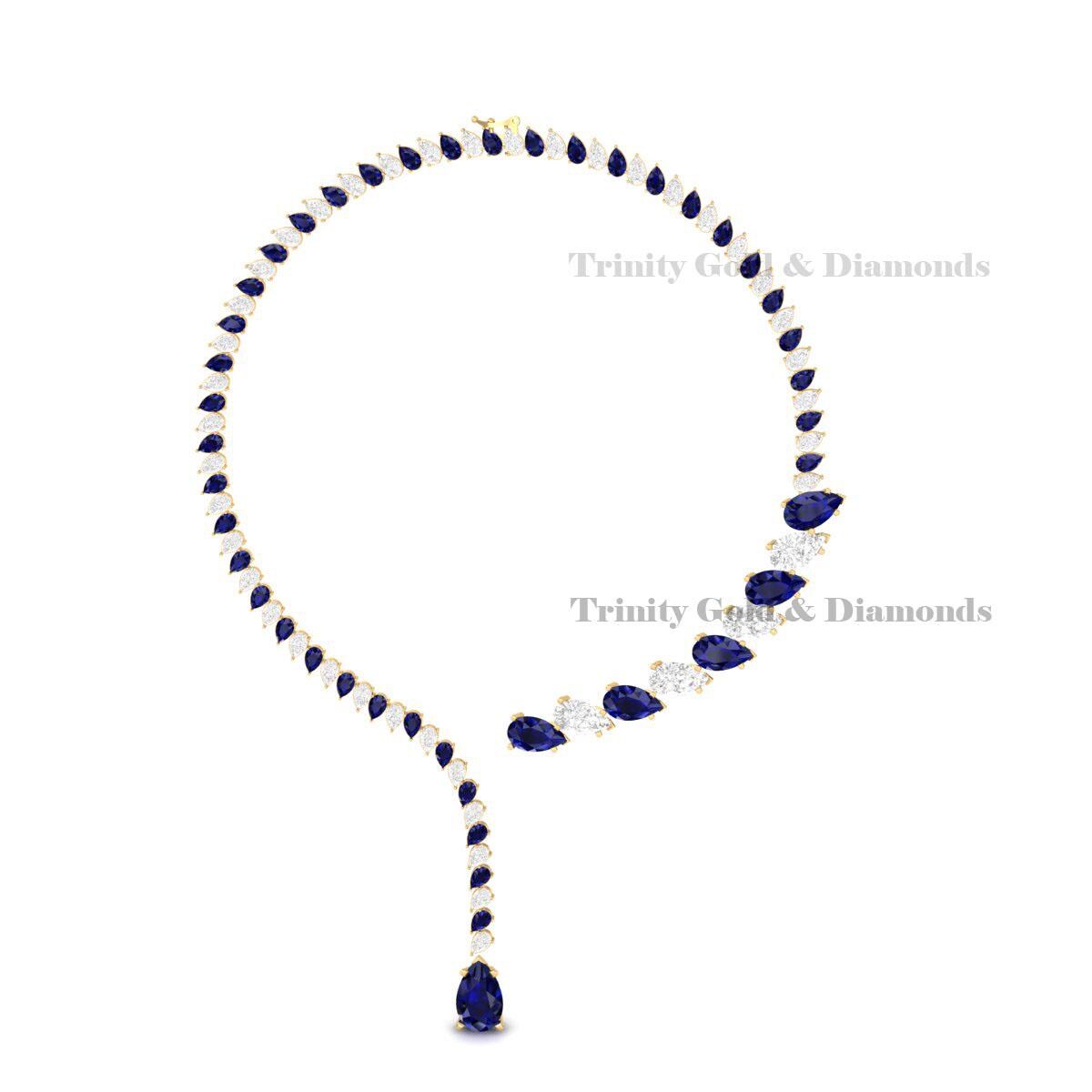 Turn heads with this luxurious sapphire blue teardrop statement necklace, crafted in fine 925 sterling silver. Designed to elevate your bridal or evening look, the asymmetrical layout with a Y-drop design features a cascade of dazzling blue and white stones that shimmer with every movement. Perfect for weddings, receptions, formal events, or gifting someone special.