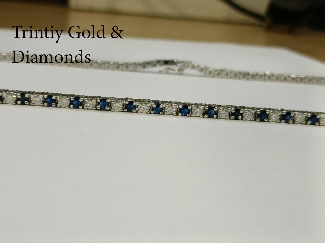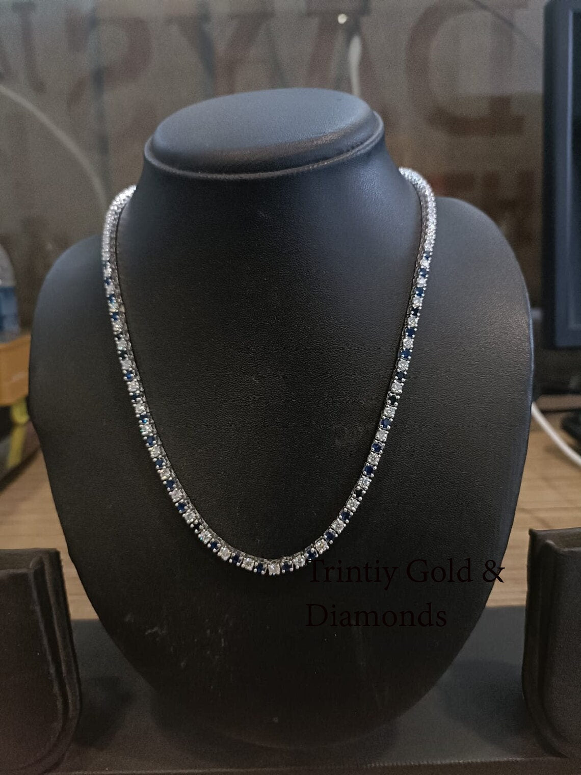 This elegant 18-inch tennis necklace features a stunning combination of vibrant blue sapphires and sparkling white moissanite diamonds, set in a classic round-cut design. Perfect for special occasions or everyday luxury, this necklace is designed to sit gracefully as a choker, adding a touch of sophistication to any outfit. Ideal as an anniversary gift, this tennis necklace is a timeless piece that blends brilliance and color, making it the perfect accessory for women who appreciate fine jewelry.