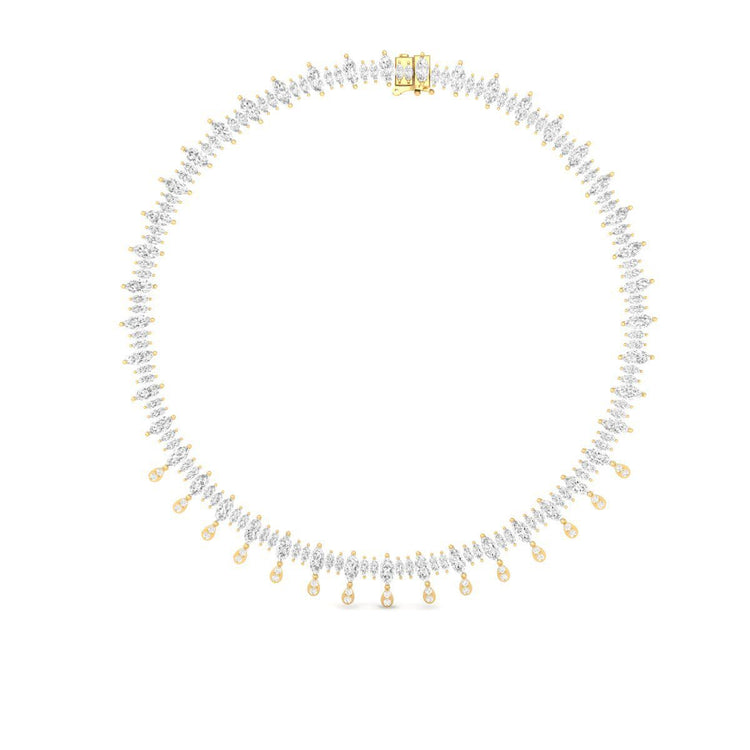 Make a breath-taking entrance with this bridal statement necklace — a sparkling arrangement of marquise-cut and teardrop Moissanite stones, handcrafted to elevate your most special occasions. The graceful drape and stunning brilliance make it an ideal piece for weddings, receptions, or festive events.