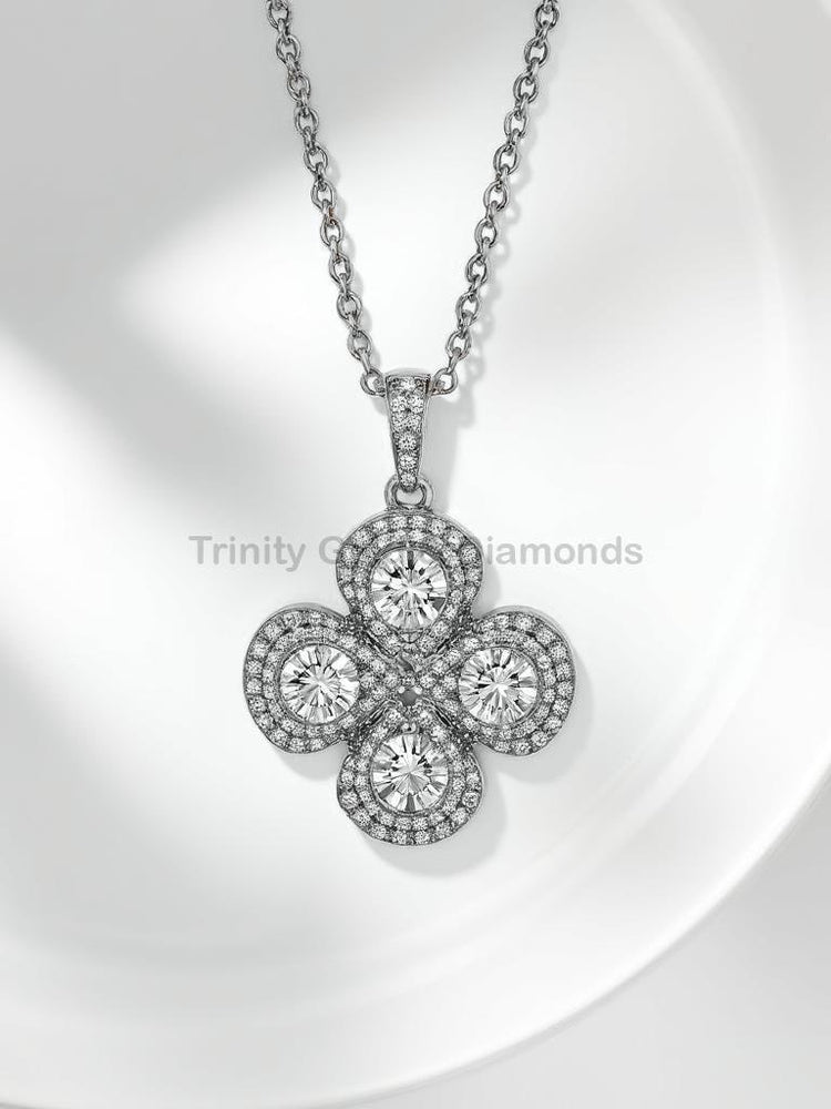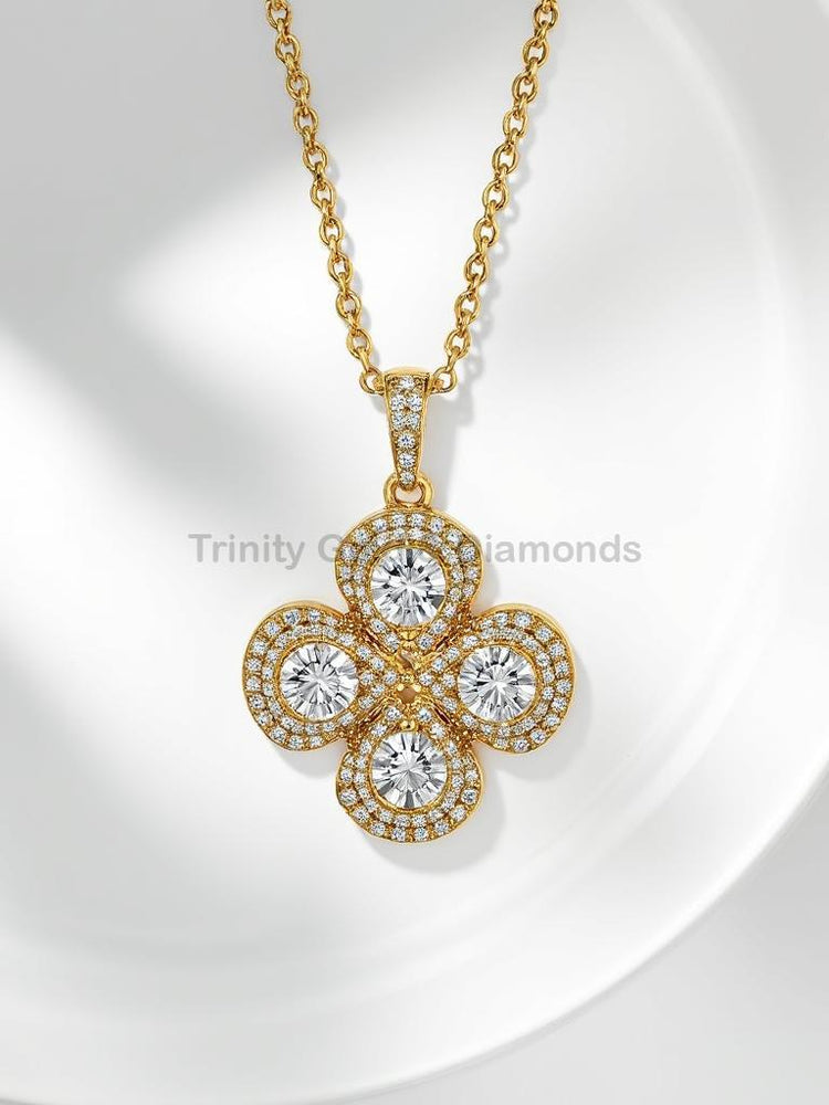 This Clover Diamond Pendant is a true symbol of timeless grace and radiant sparkle. Featuring four large round brilliant-cut diamonds as floral petals, each surrounded by a double halo of pavé-set diamonds, this pendant is crafted in rich yellow gold and suspended from a matching diamond-studded bail. A luxurious piece ideal for special occasions, bridal jewelry, or as a meaningful gift that embodies elegance and good fortune. chain will be cable chain, product will be 100% match.