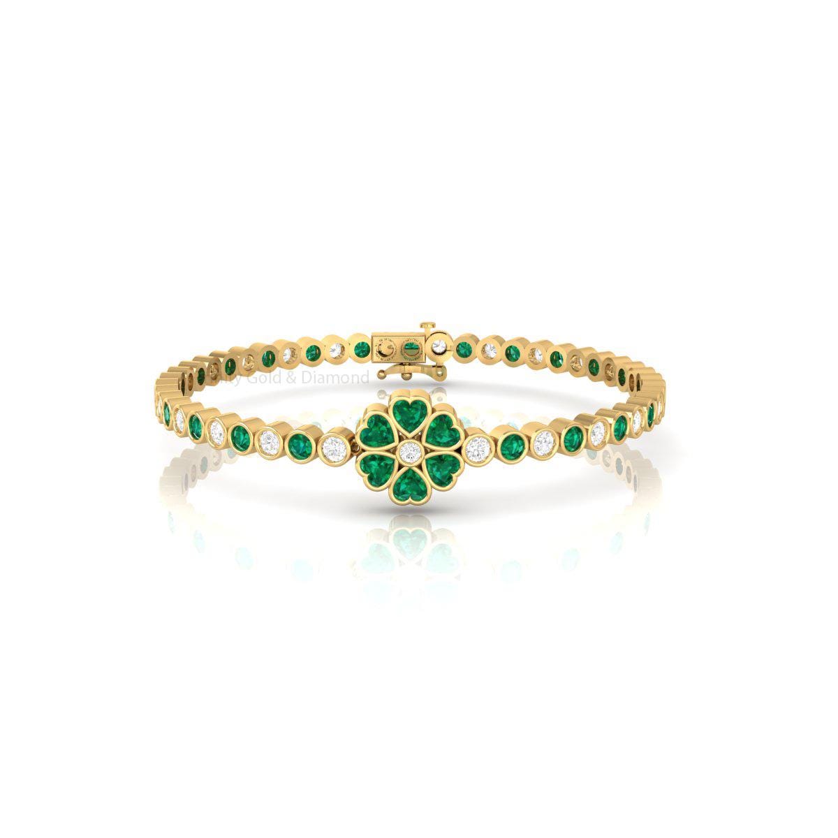 Bring a touch of luck and luxury to your collection with this stunning clover-shaped emerald and diamond bracelet. Featuring heart-cut green emeralds forming a floral four-leaf clover centerpiece, this bracelet combines playfulness with elegance. Accented by round brilliant diamonds and bezel-set emeralds, the piece is handcrafted in a radiant gold finish—perfect for meaningful gifting or adding a vibrant charm to your everyday style.