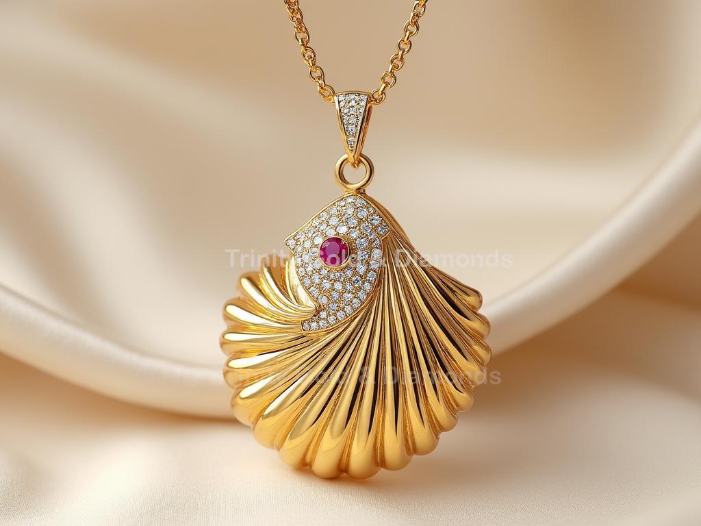 Elegant and radiant, this gold seashell pendant necklace captures the allure of the ocean in a refined, sculptural form. The textured shell is enhanced by sparkling stones and a vibrant ruby-like gem detail, offering a luxurious coastal vibe. Ideal for summer outfits, tropical getaways, or beach-inspired gifting, this pendant celebrates sea beauty and timeless femininity..image is ai generated