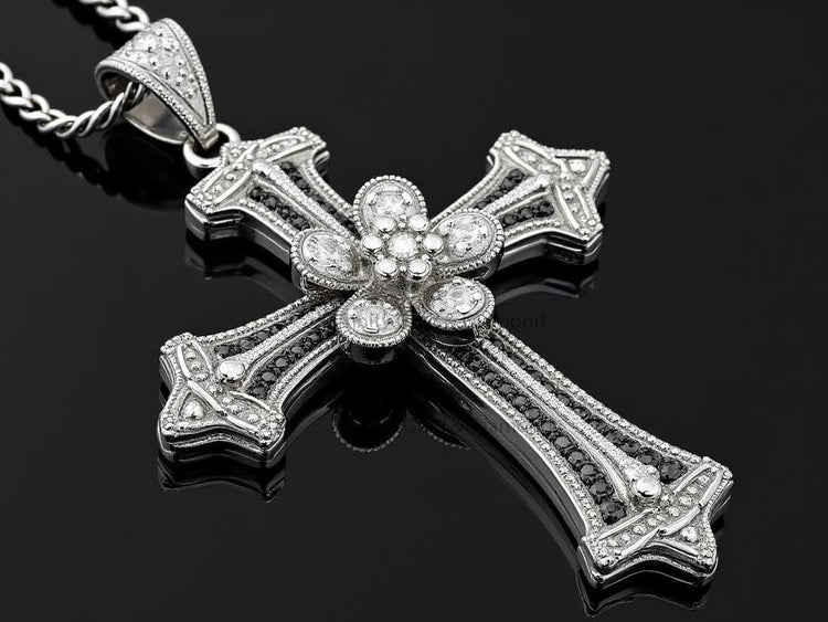 Exquisitely designed for lovers of gothic fashion and religious symbolism, this sterling silver cross pendant features ornate detailing and a central flower motif. The cross arms are studded with black stones, while the flower is set with shimmering white stones, offering a striking contrast. Finished with fine milgrain edging and a high-polish shine, this pendant is a unique, meaningful accessory for men or women. image is ai generated.