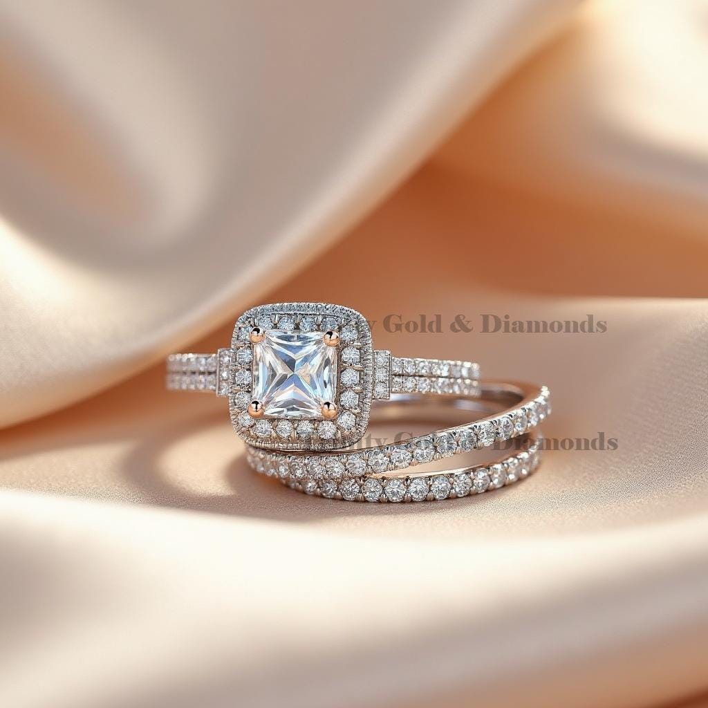 This princess-cut bridal ring set features a dazzling halo design with a square center stone, paired with two elegant pavé bands for a luxurious stacked look. Handcrafted in 925 sterling silver, it mimics the brilliance of high-end moissanite or lab-created diamonds. image is ai generated.