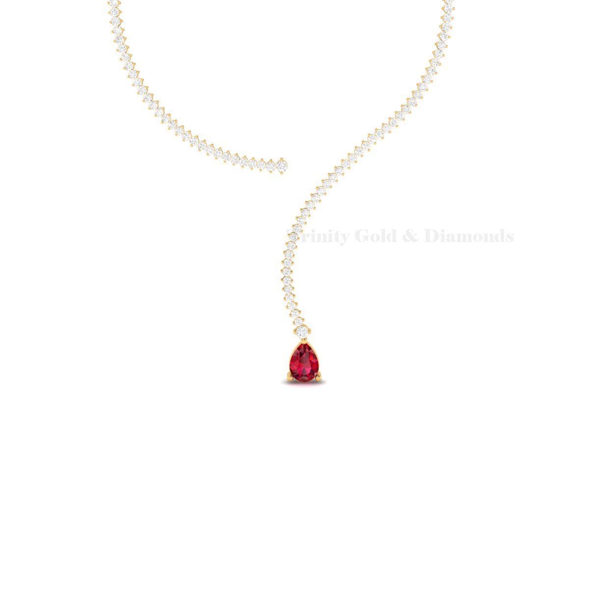 Grace your neckline with the luxurious sparkle of this ruby drop choker necklace. Crafted in 925 sterling silver with gold plating, it features a sleek line of shimmering moissanite or cubic zirconia stones, ending in a vibrant pear-cut ruby drop. This elegant and modern design makes it the perfect piece for bridal wear, special occasions, or a statement gift.