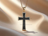This bold black cross pendant showcases a thick-armed design with a slight curve, making it a modern and masculine take on classic faith jewelry. Paved with shimmering black stones and set in a lustrous gold finish, this piece is a perfect blend of strength and style. Ideal for daily wear or gifting.